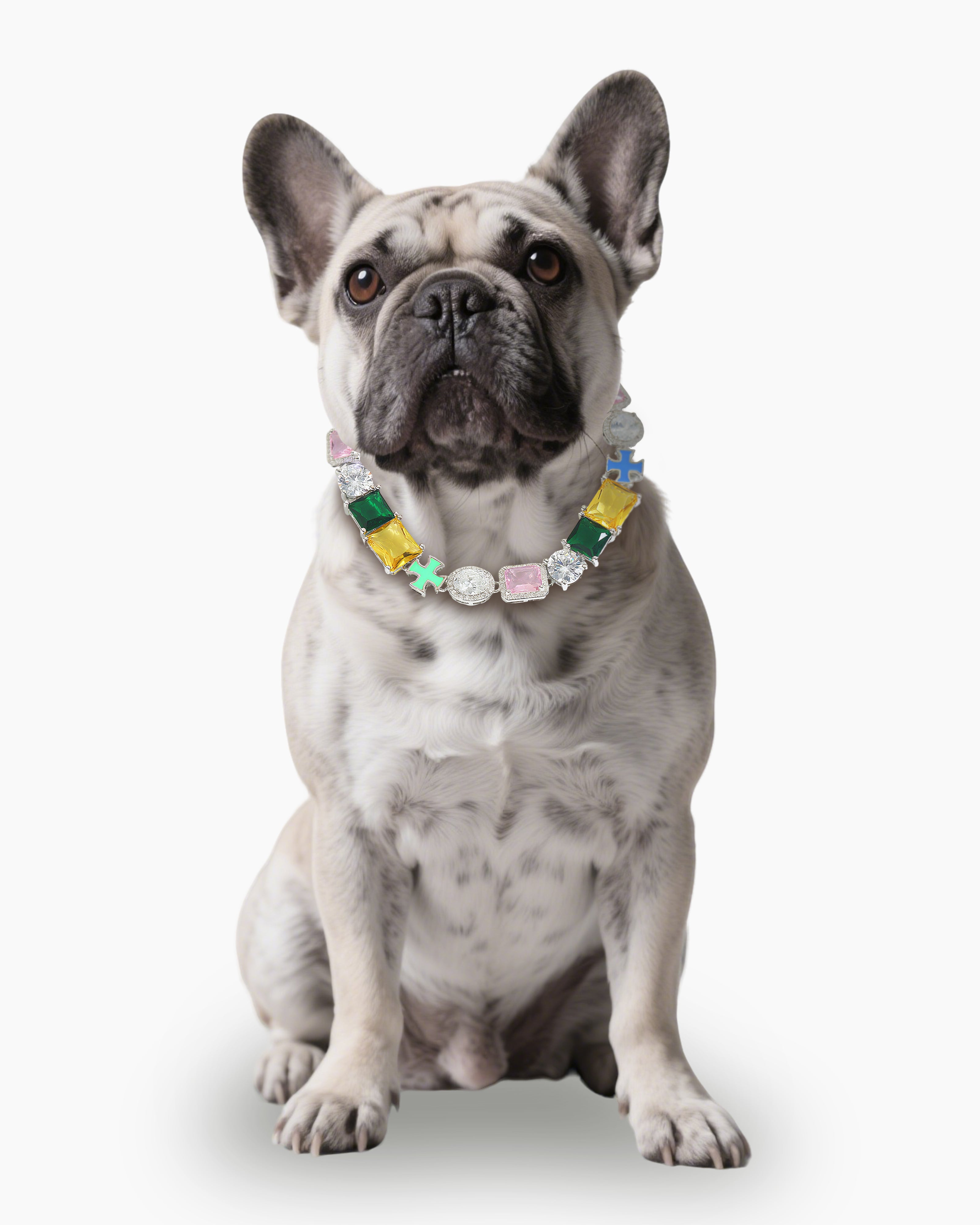 The Chroma Saint · Pet & Me Edition is a matching set featuring a dog collar, dog necklace, dog chain collars, and personalized bracelet for owners. With vibrant gemstones, guardian cross motifs, and elegant hand chains, charm bracelets, and bracelets for men, this fashion accessory celebrates the unspoken bond and loyalty between you and your furry companion.